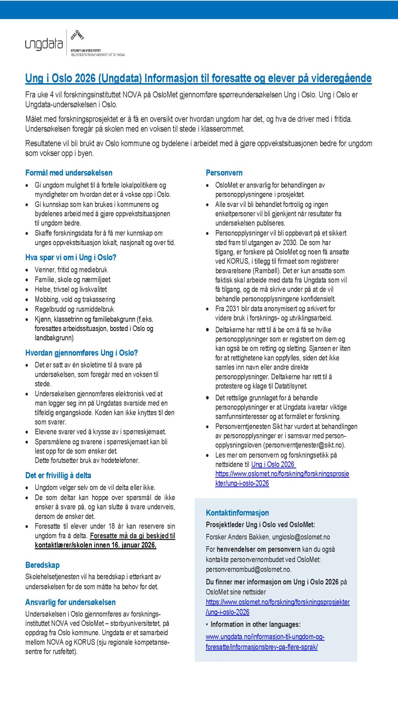Ungdata-undersøkelsen i Oslo skal i 2026 gjennomføres for åttende gang. Ung i Oslo er et unikt forskningsprosjekt som har blitt gjennomført jevnlig siden 1996. Den vil gi viktig kunnskap om hvordan det er å vokse opp i Oslo, og hvordan dette har endret seg over tid. Undersøkelsen er en god mulighet for ungdom til å fortelle politikere, forskere og andre om deres hverdagsliv og livssituasjon.